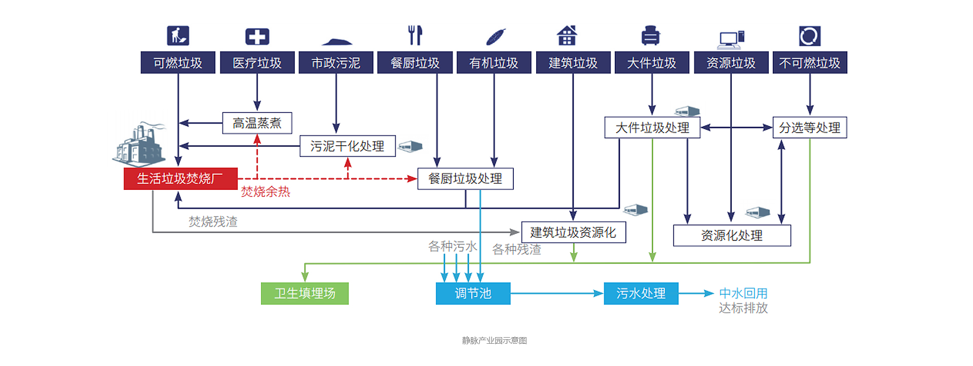 低碳靜脈產(chǎn)業(yè)園協(xié)同技術(shù): 低碳靜脈產(chǎn)業(yè)園協(xié)同技術(shù)是以生活垃圾焚燒發(fā)電為核心,集市政污泥、醫(yī)療垃圾、餐廚垃圾、建筑垃圾等廢棄物一體化處理。在低碳靜脈產(chǎn)業(yè)園里,垃圾焚燒發(fā)電的余熱可供給污泥干化、餐廚發(fā)酵、醫(yī)療垃圾高溫蒸煮等,同時(shí)各類固廢處理的可燃?xì)堅(jiān)挚苫厥盏椒贌隣t焚燒,產(chǎn)生熱能,從而實(shí)現(xiàn)物質(zhì)與能源的循環(huán)利用。 |