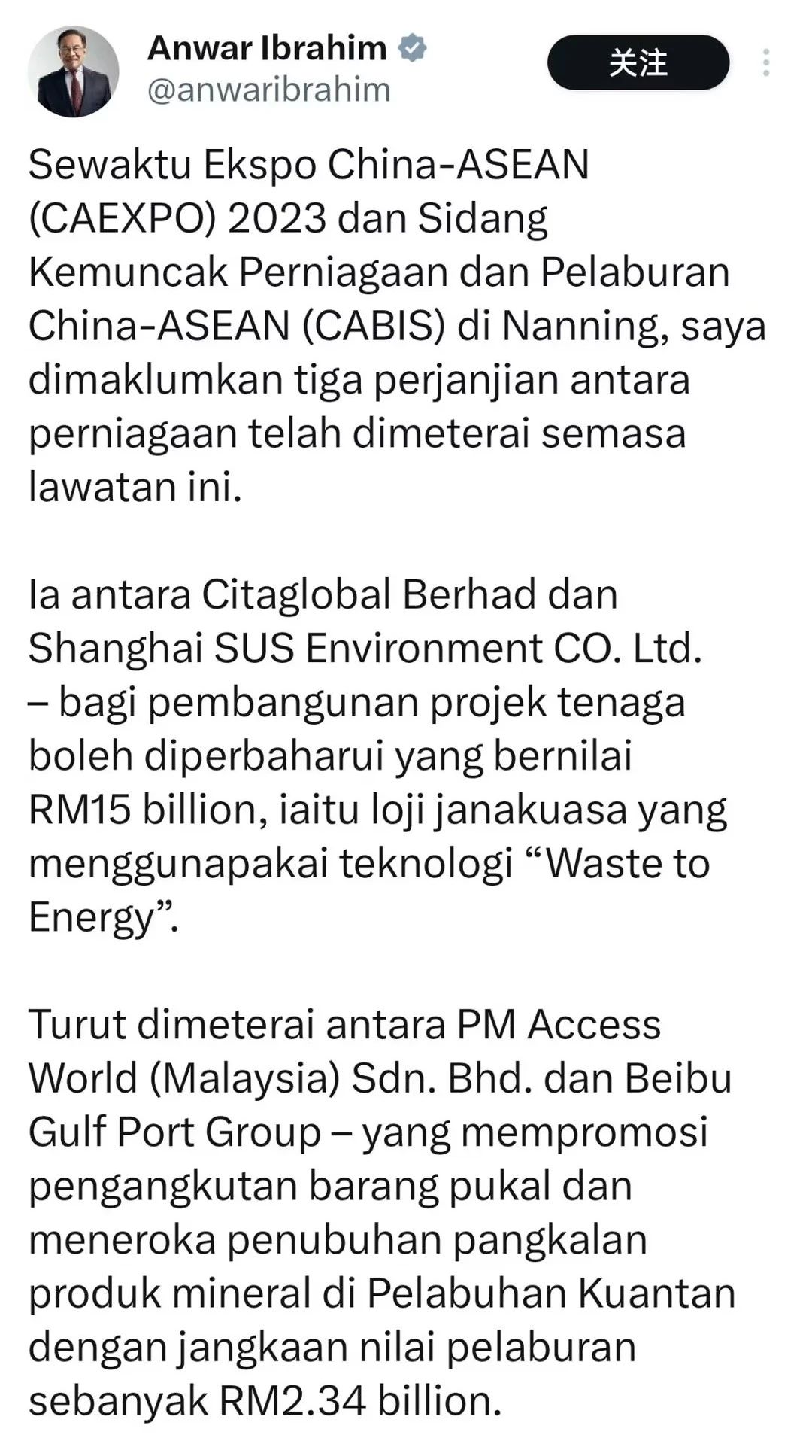 (安瓦爾社交媒體轉發(fā)康恒環(huán)境與馬方企業(yè)簽約成果)